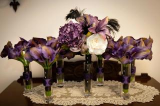Our round tables had white tablecloths with black tops. The centerpieces were simple with mirrors and lots of candles. We used white calla lilies and turned water and wine glasses upside down for candle holders with purple carnations inside. Inside the vases were water beads and submersible LED lights.