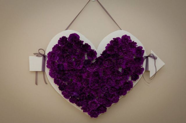 The beauty of this wedding was found in the detail. Esther has a great eye for detail and thus wanted to make sure special attention was paid to every aspect of her wedding day from the moment guests entered the church. We had fun making some special features for the lobby. My personal favorite were the trees. I’m planning to post a separate explanation of the making of these trees in a blog post to come. However, for now suffice it to say they were stunning! Four tree branches about six foot high concreted into coffee cans, were painted and glittered. We strung beads and glued purple hydrangea blossoms for a sweet effect, and put two on each side of the foyer where guests entered. This made a path to the guest book area that was decorated with tulle, lights, calla lilies and a large portrait of the couple.