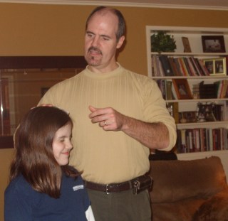 So, a plan was born and we set out to hit every Wal-Mart in Oklahoma to collect our lamps. (It was going to take too long to order online, if you were wondering). We hit up about seven or so stores in three or four different cities. Then we hit the dollar store for plastic tablecloths. Yes, you read it right $1.00 plastic tablecloths in pink to cover our shade and we had instant mood lighting for our Valentine Banquet. I was so excited over it that I just wanted to sit in there for as long as possible basking in the pink glow. This was one of our greatest decorating successes as it landed in the category of cheap and easy…something in which we do not excel.Daddy’s Magic